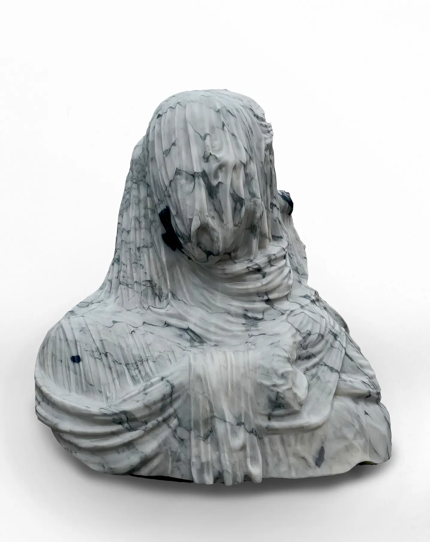 Overtrained, debuting at Art Basel Hong Kong, expands on Cayetano Ferrer's ongoing exploration of the inheritances of visual culture, morphologies and misappropriations of historical forms. The machine-carved sculptural objects of Overtrained â ornate capitals, a veiled bust and relief tablets, in varied coloured stone â materialise Ferrer's investigation into the relationship between technologies of the future and formal legacies of the past. They are presented with the newest iteration of Ferrer's signature carpet works, constructed from fragments of reclaimed dead-stock casino carpet, sets of patterns referencing motifs from across art and design histories collaged into an imaginary architectural foundation. Working with a custom text-to-image diffusion model fine-tuned on the archives of museum collections, Ferrer found that it became "overfit" on the dataset: having learned its training data too precisely, the model verges on breakdown and incoherence. This excessive training on a limited dataset produces distinctive distortions, where concepts in the visual archive bleed into one another. The resulting outputs, dense with visual references and incomplete logics, open up a gulf between the recognisable and the comprehensible. Familiar cultural profiles spanning centuries and continents, such as sculptural busts and column capitals, are pushed, stretched and ultimately untethered from the associations and assumptions with which one might approach them. The work raises questions about what is lost when archival structures are dissolved into statistical relations, and about the forms that emerge from a collapse of the distinctions on which historical meaning depends. Ferrerâs carpet collage forms a unifying ground across the booth and echoes the sculpturesâ allusions to disparate art historical periods and styles, creating an associative space reminiscent of a ruinâs foundations. Outlines of rooms, floor mosaics and architectural fragments are pieced together in motifs adjacent to foliage, stone and ponds. In Ferrer's practice, found materials and architectural remnants act as vehicles for unpacking the distinctions between high and low culture; authentic and speculative; historical fact and wild invention. Overtrained builds on these concerns to examine recent technological and philosophical debates posed by non-human logics operating within the sphere of cultural creation and heritage.